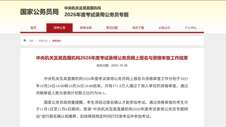 “诗意审核”的背后是人——审核人员不仅是制度的守门人,同时也是梦想的同行者。刚性的制度,转用柔性的话语体系沟通,巧妙安抚考生备考的焦虑情绪。日前,国家公务员局通报中央机关及其直属机构2026年度考试录用公务员网上报名情况。数据显示,国考共有371.8万人通过资格审查,比去年增加30万人。通过资格审查人数与录用计划数之比约为98:1,其中,最热门岗位有超过7000人参与竞争。